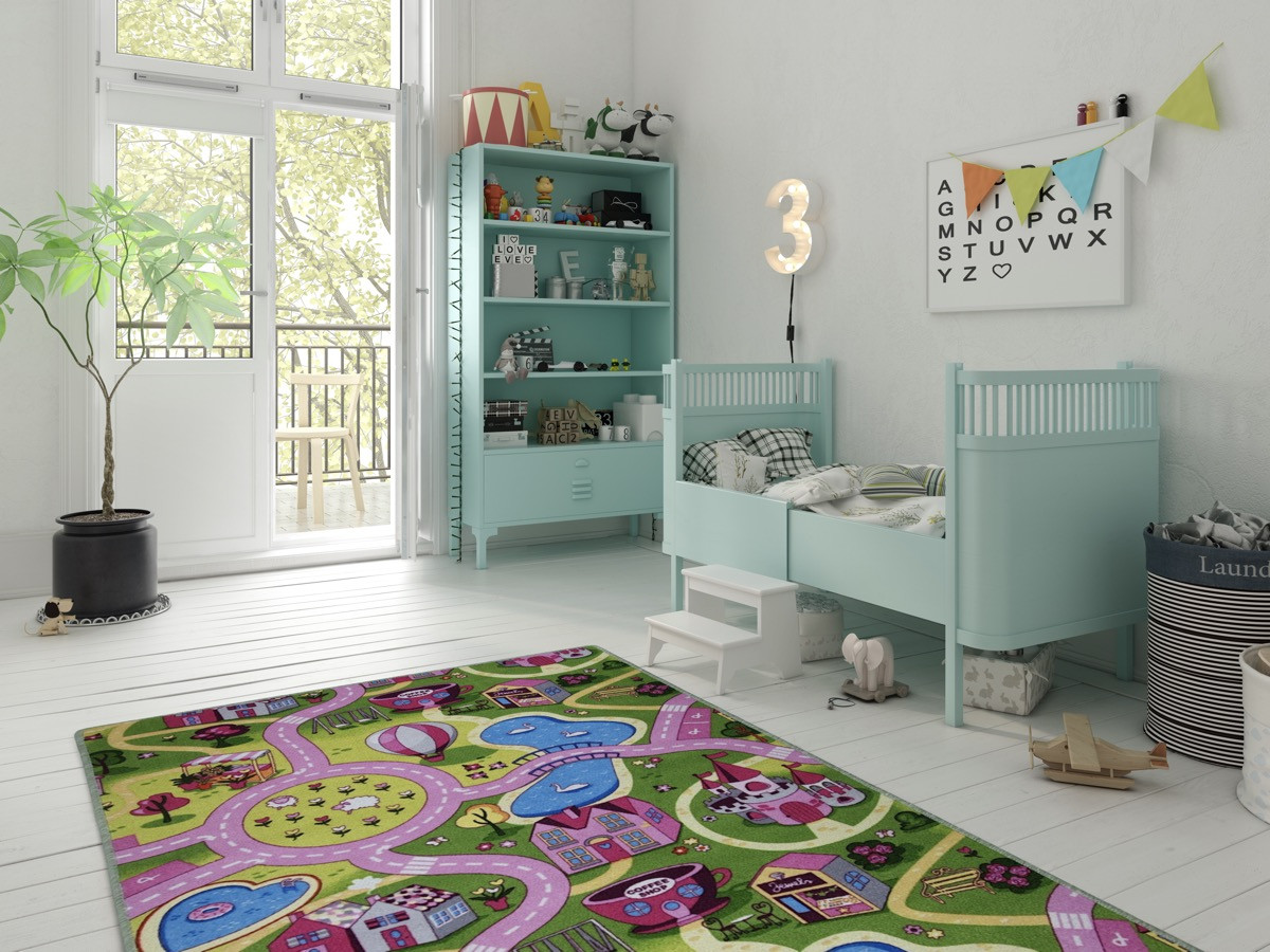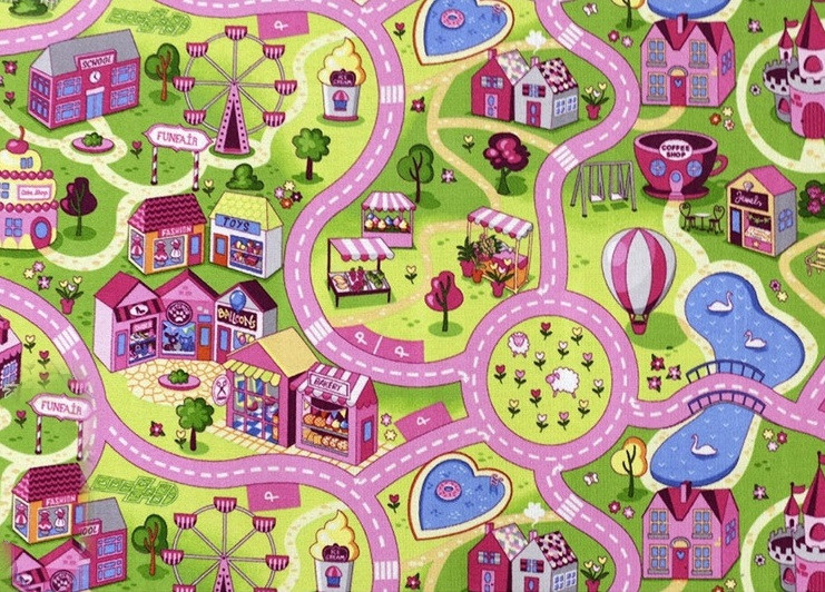 Cesty nie sú len pre chlapcov. Nájdete tu zábavné parky, jazierka, tajuplné zámky … Skvelý darček pre Vašu dcéru, ktorý jej prinesie veľa zábavy. Koberec je vyrobený z polyamidu, čo je pevný a odolný syntetický materiál, ktorý toho znesie naozaj veľa. Pretože sa koberec reže z role, môže byť potlač na každom koberci rôzne posunutý. Farba obšitia sa môže líšiť.